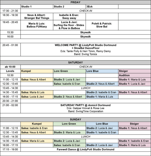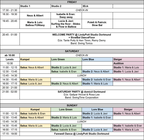 You can choose a maximum of 2 tasters on friday (2h of classes), which do not overlap, one level for saturday and sunday (7,5h of classes). Dance partners have to be in the same level.