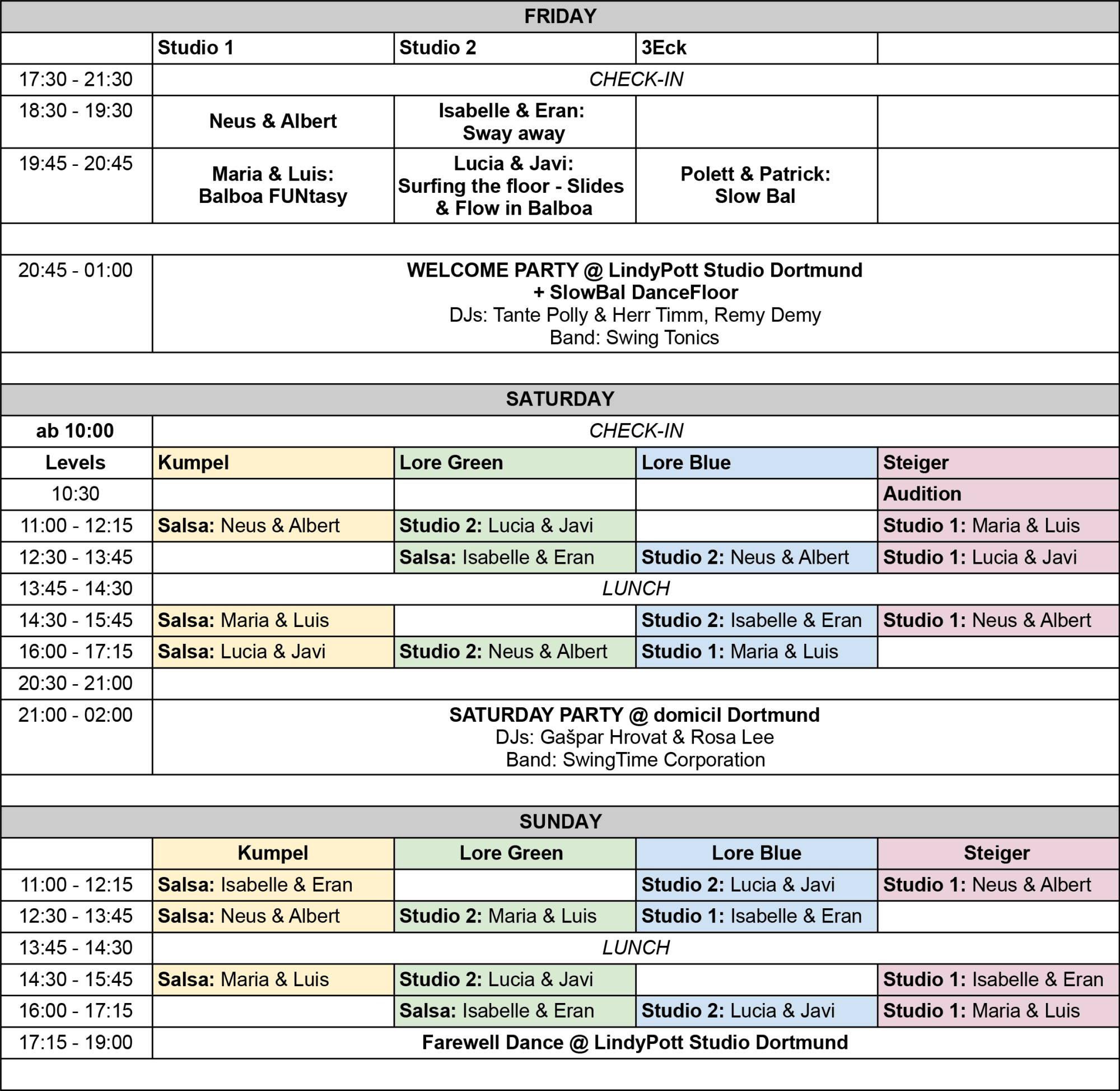 You can choose 1 level for the whole weekend. Including classes on Saturday and Sunday (7,5h of classes). Dance Partners have to be in the same level.
